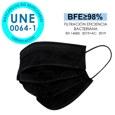 Mascarilla Higiénica con Equivalencia a Mascarilla Quirúrgica Tipo IIR - Color Negro (No Reutilizable) (50 Unidades - 0,30€/ud)
