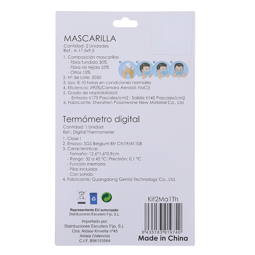 Mascarillas higiénicas de protección desechables: 2 mascarillas civiles de protección desechables R95. Estas mascarillas están compuestas por un tejido de 3 capas, diseño plegable y ajustable, tiras elásticas para las orejas y sujeción flexible adaptable a la nariz.